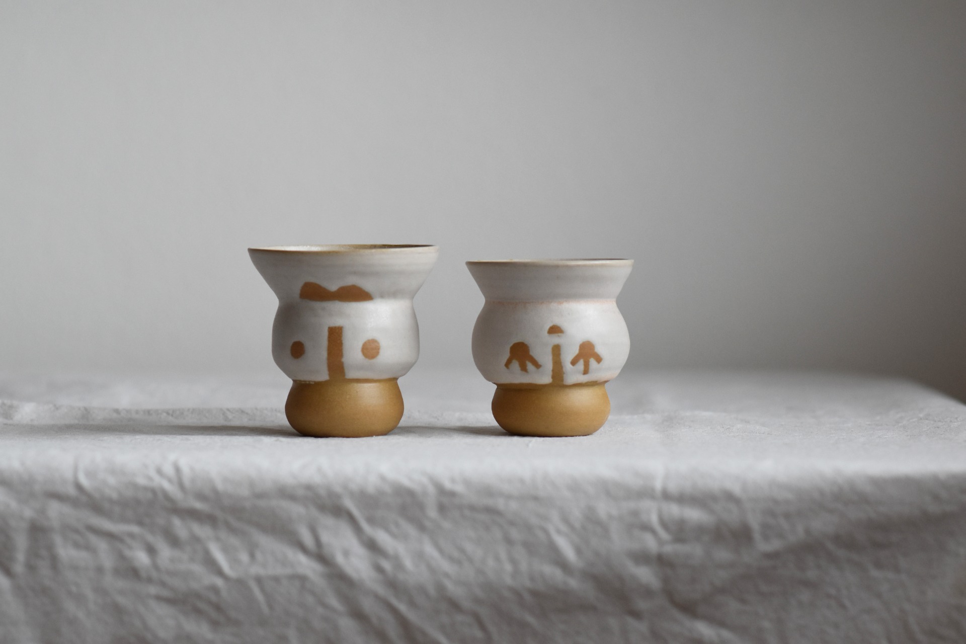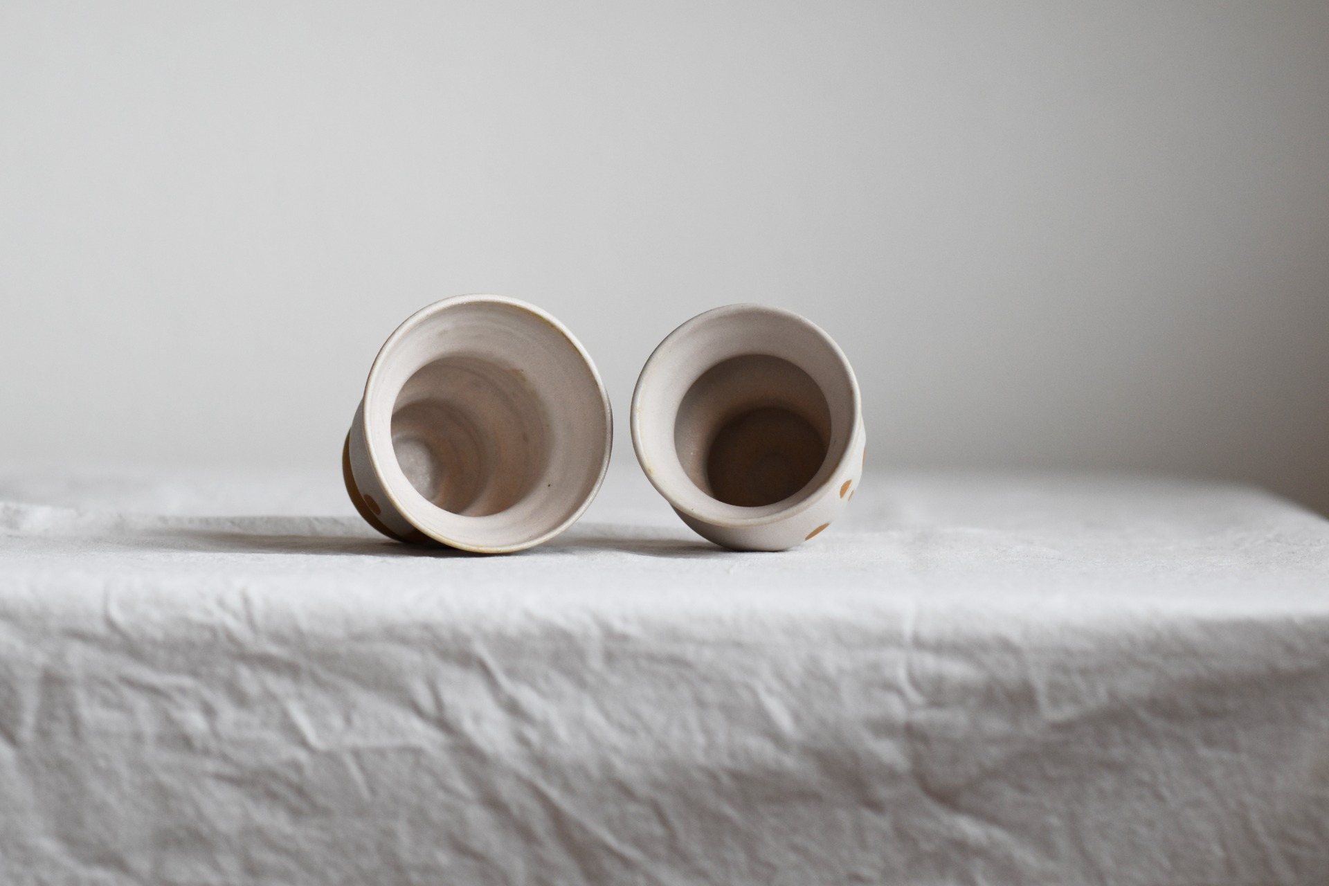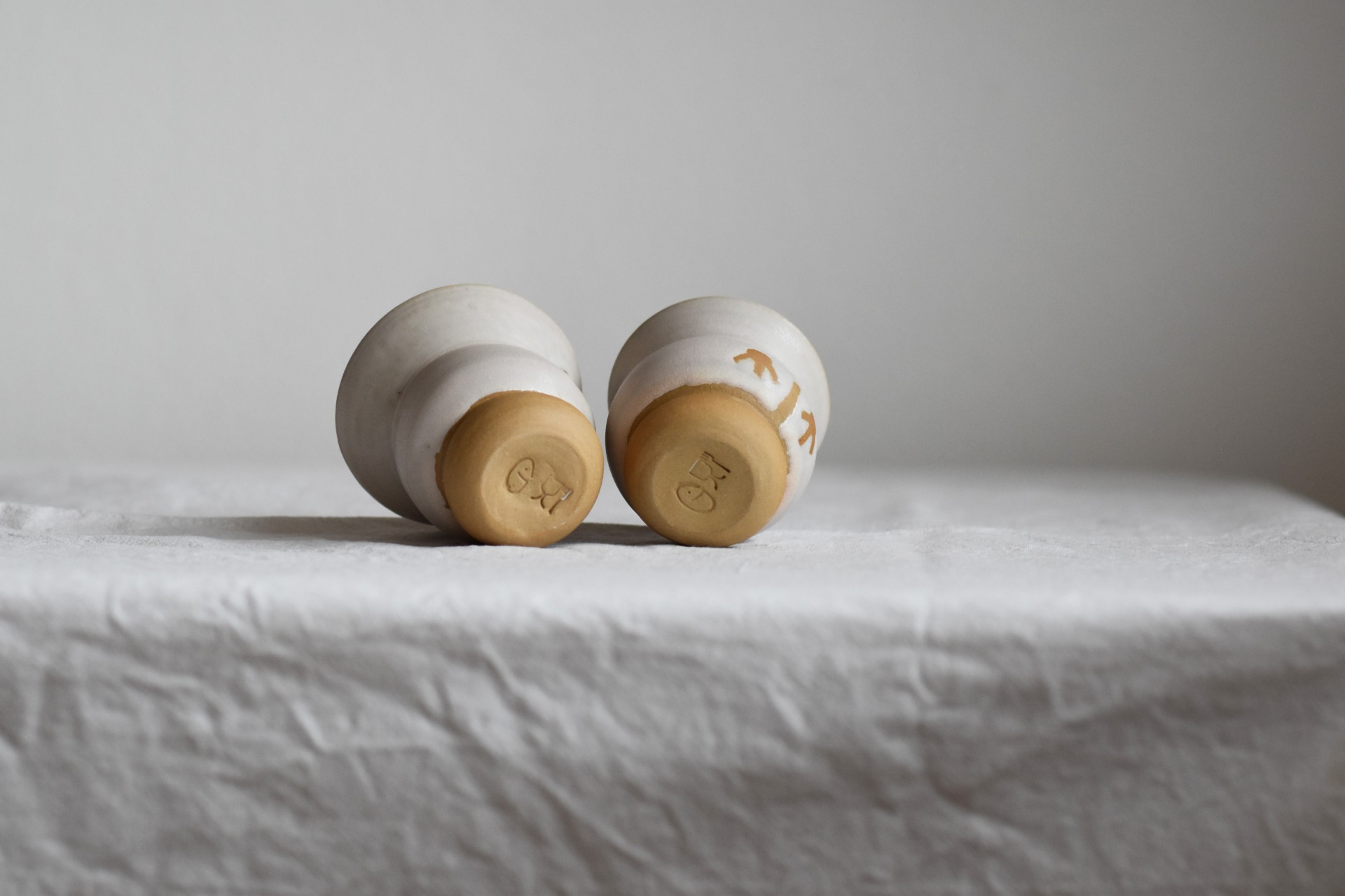 Dva kalíšky na nápoje, větší o objemu 180 ml, menší 120 ml. Třeba pro dvě kamarádky, z nichž každá je jiná a přesto si spolu rády dají kafíčko? Vnitřek glazovaný, atest na nezávadnost glazury pro styk s potravinami samozřejmostí.