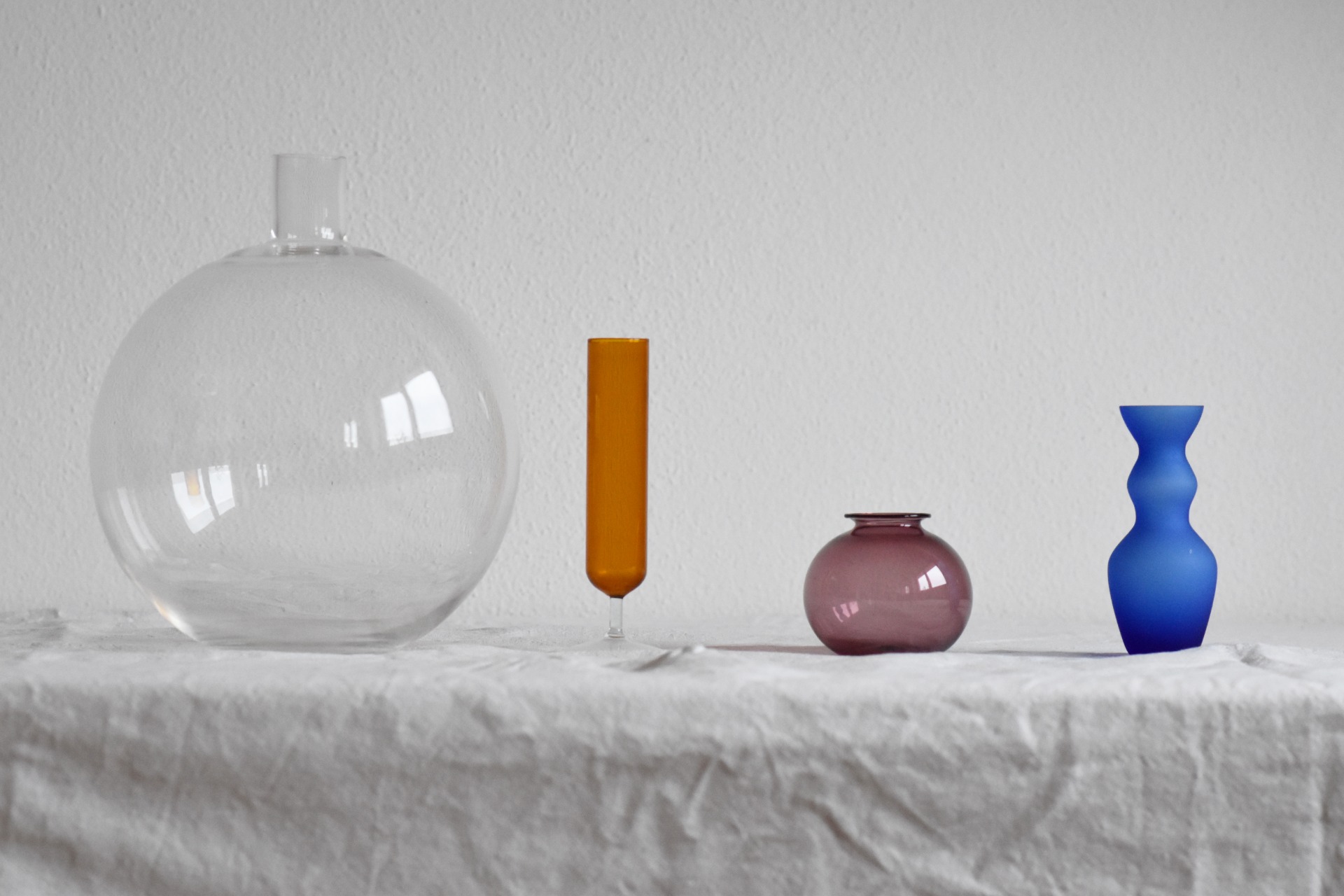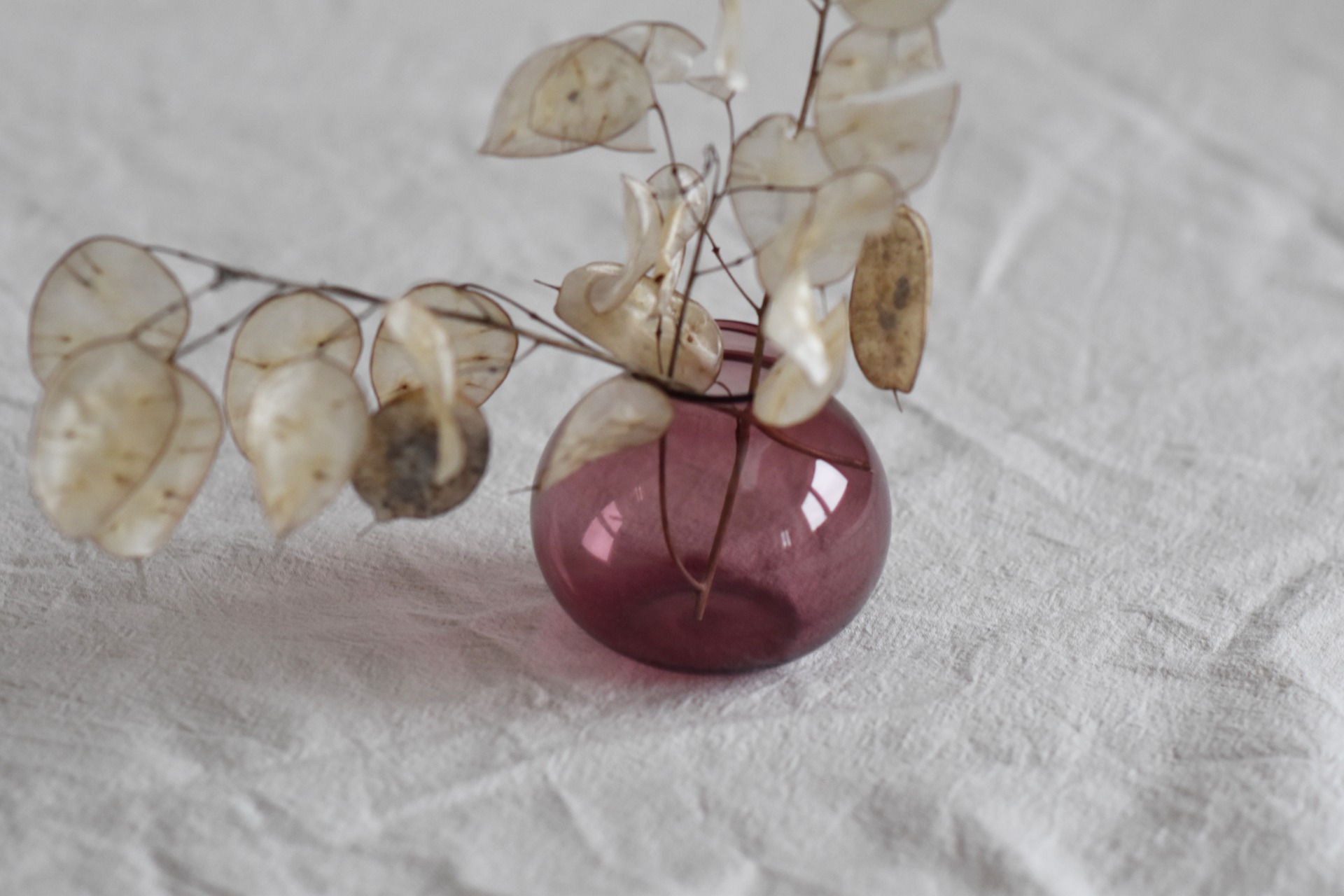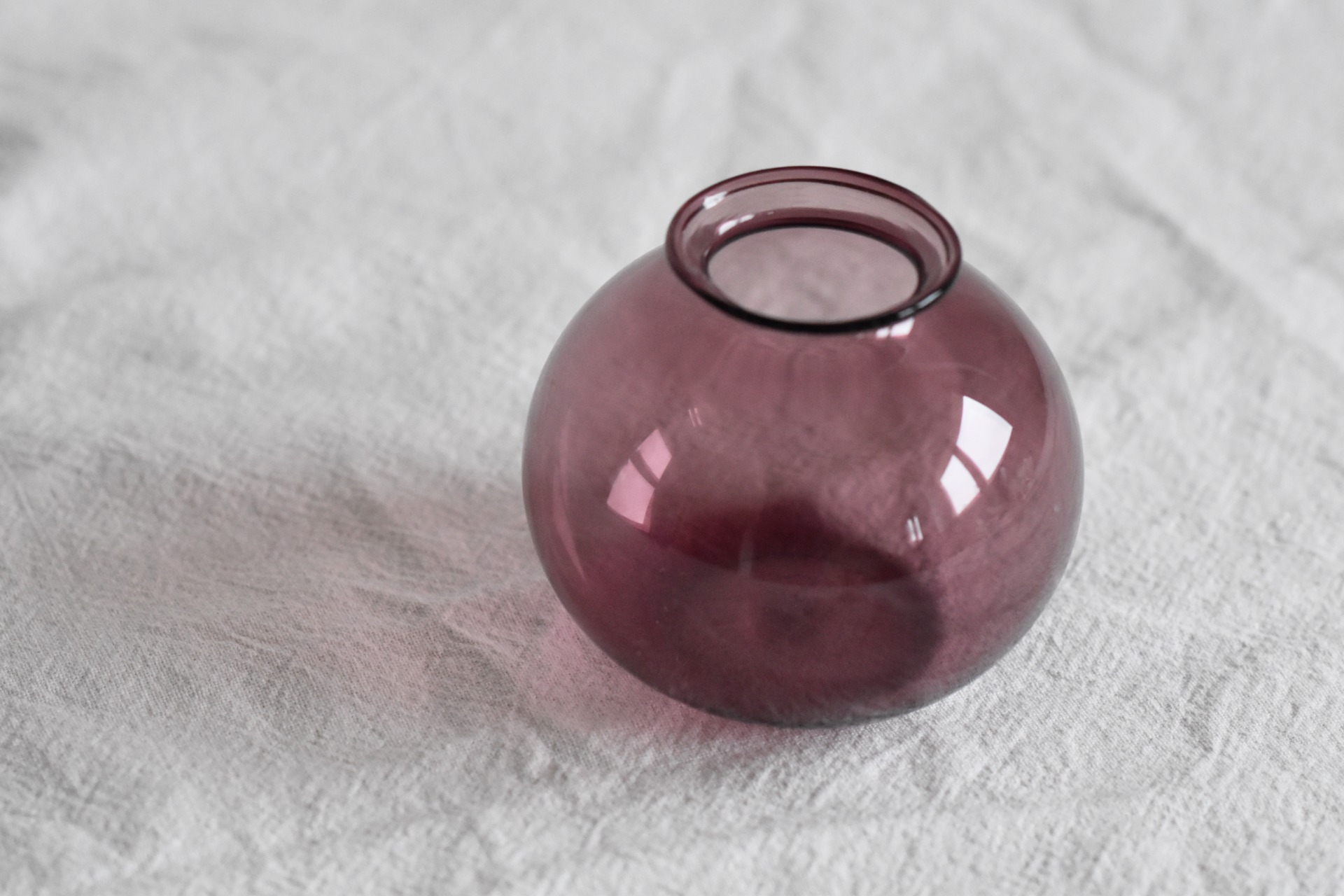 Kulatá skleněná vázička. Někdy se zdá víc růžová, jindy fialová, asi jako pivoňka. Výška 7 cm.