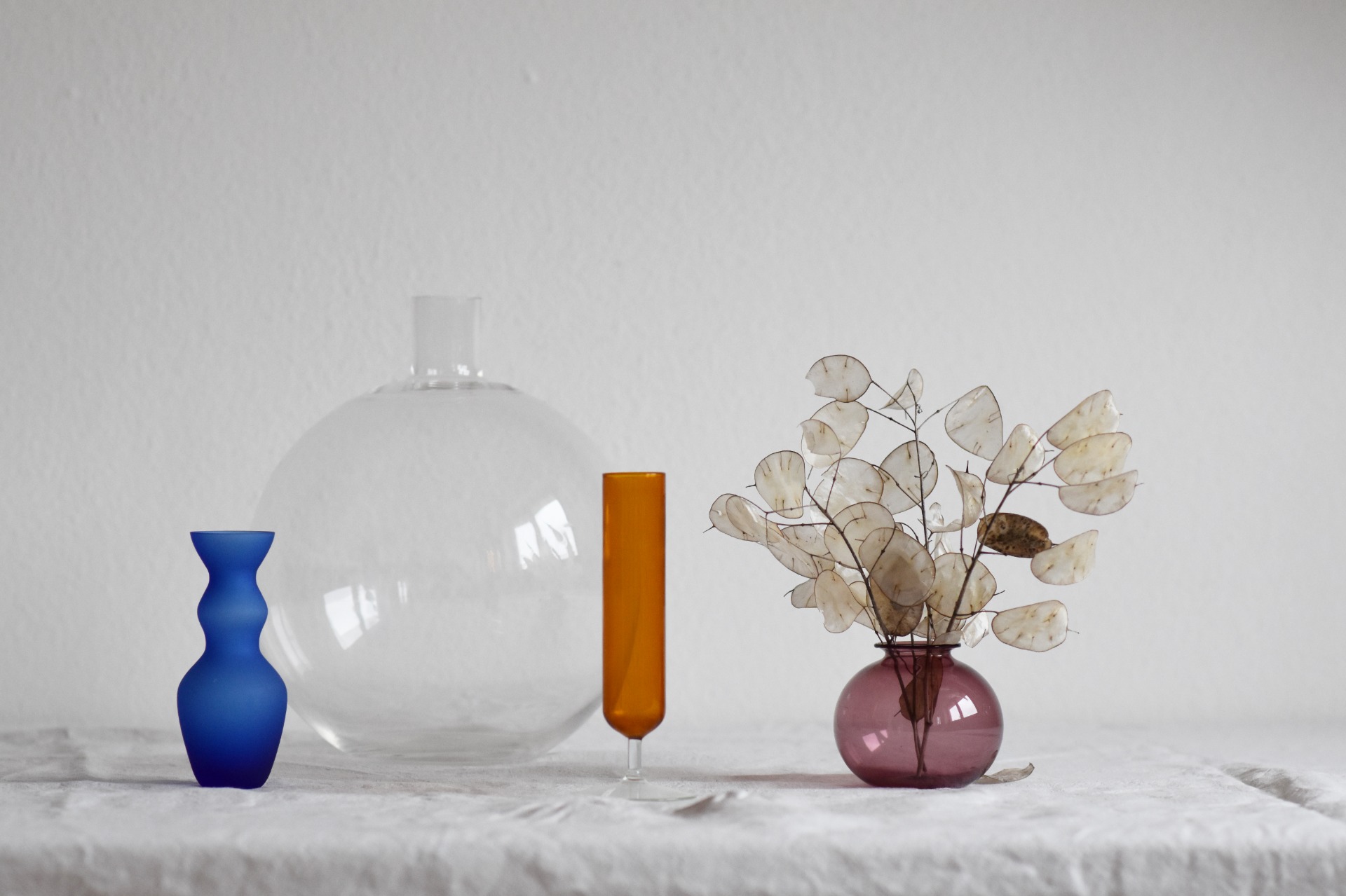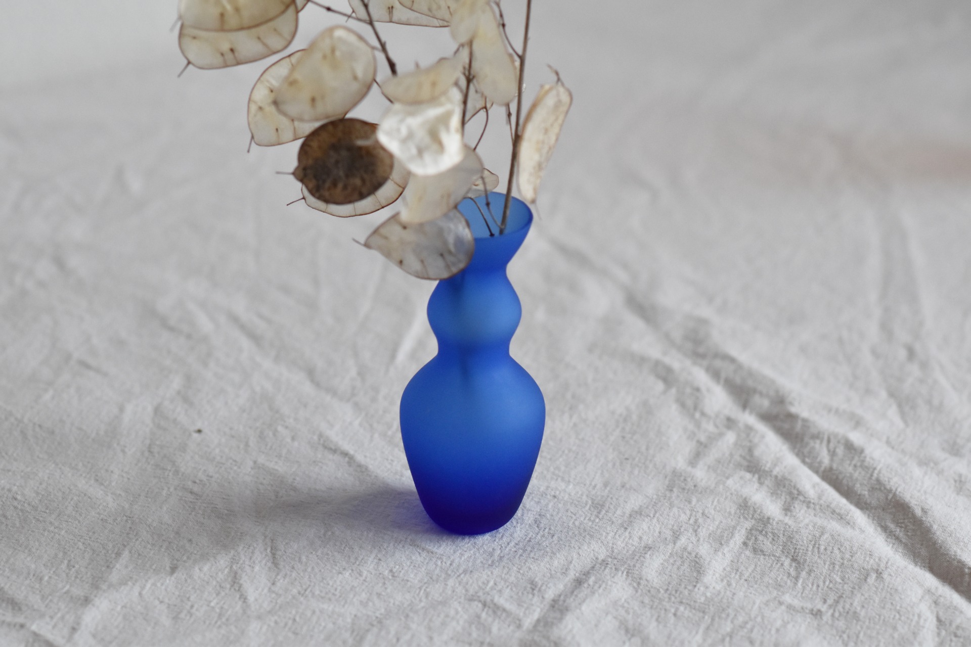Modrá vázička ze skla s matným povrchem. Sytá barva a výrazný tvar jen vyšperkují krásu každé květiny i interiéru. Malinká bublinka na povrchu viz foto. Výška 12 cm.