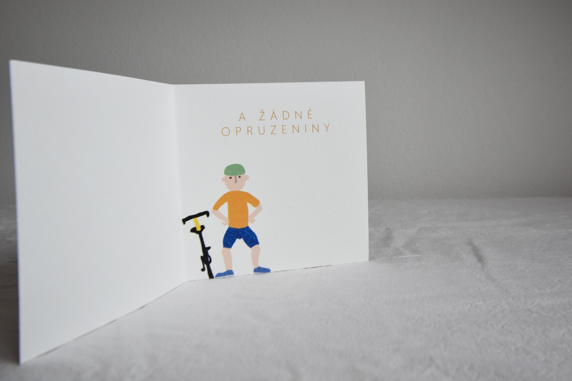 Originální a vtipné přání pro všechny cyklisty a cyklisty. Pointa na vnitřní straně, přesto poskytuje dost prostoru pro váš text. Vytištěno na strukturovaném tónovaném papíru. Rozměr 14x14 cm. Pokud chcete více kusů, pište, domluvíme se. V případě zájmu o obálku je potřeba ji přidat do košíku jako samostatnou položku, děkuji za pochopení.
