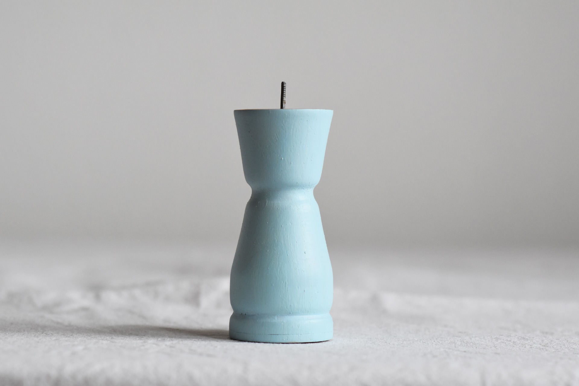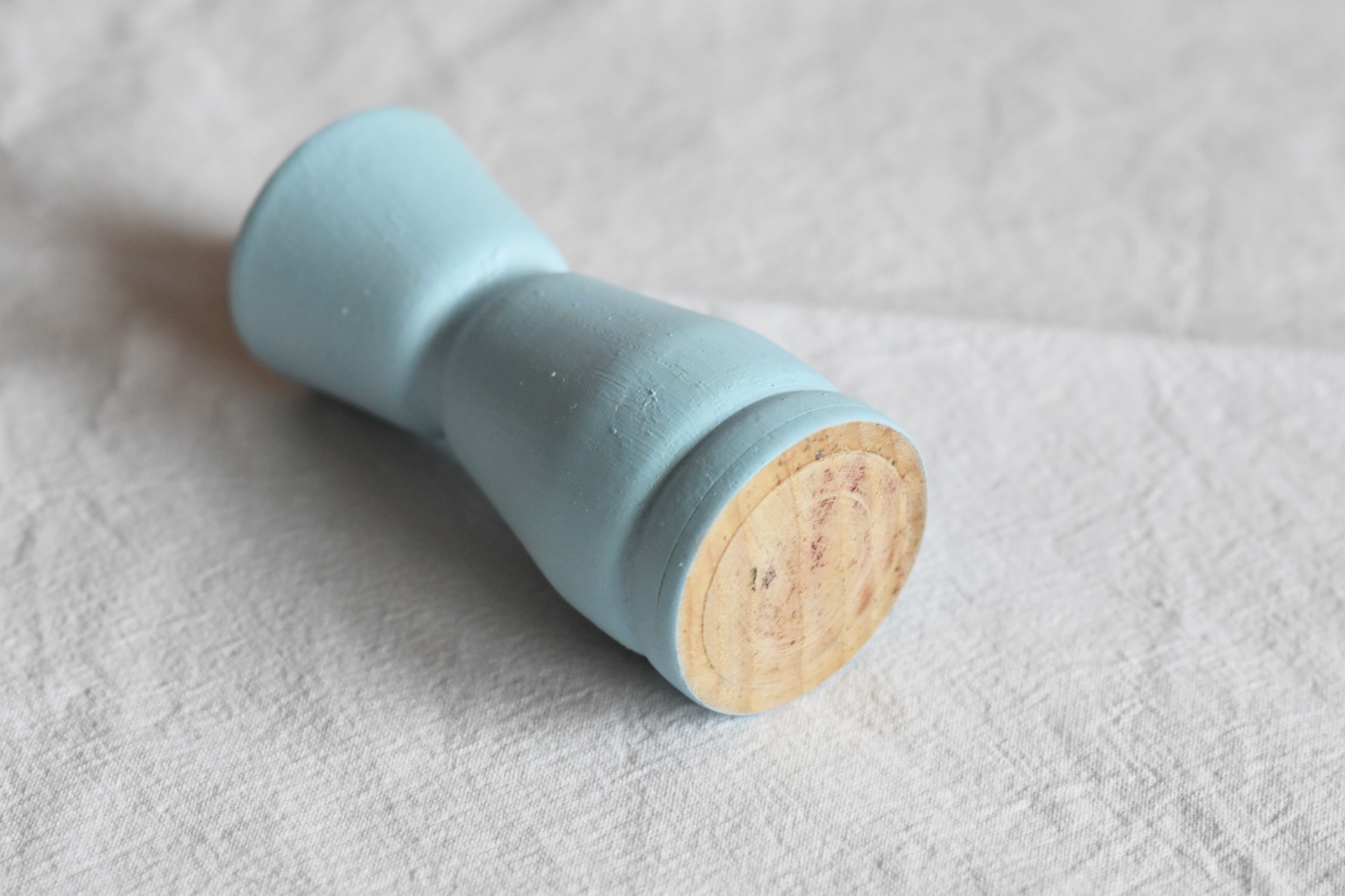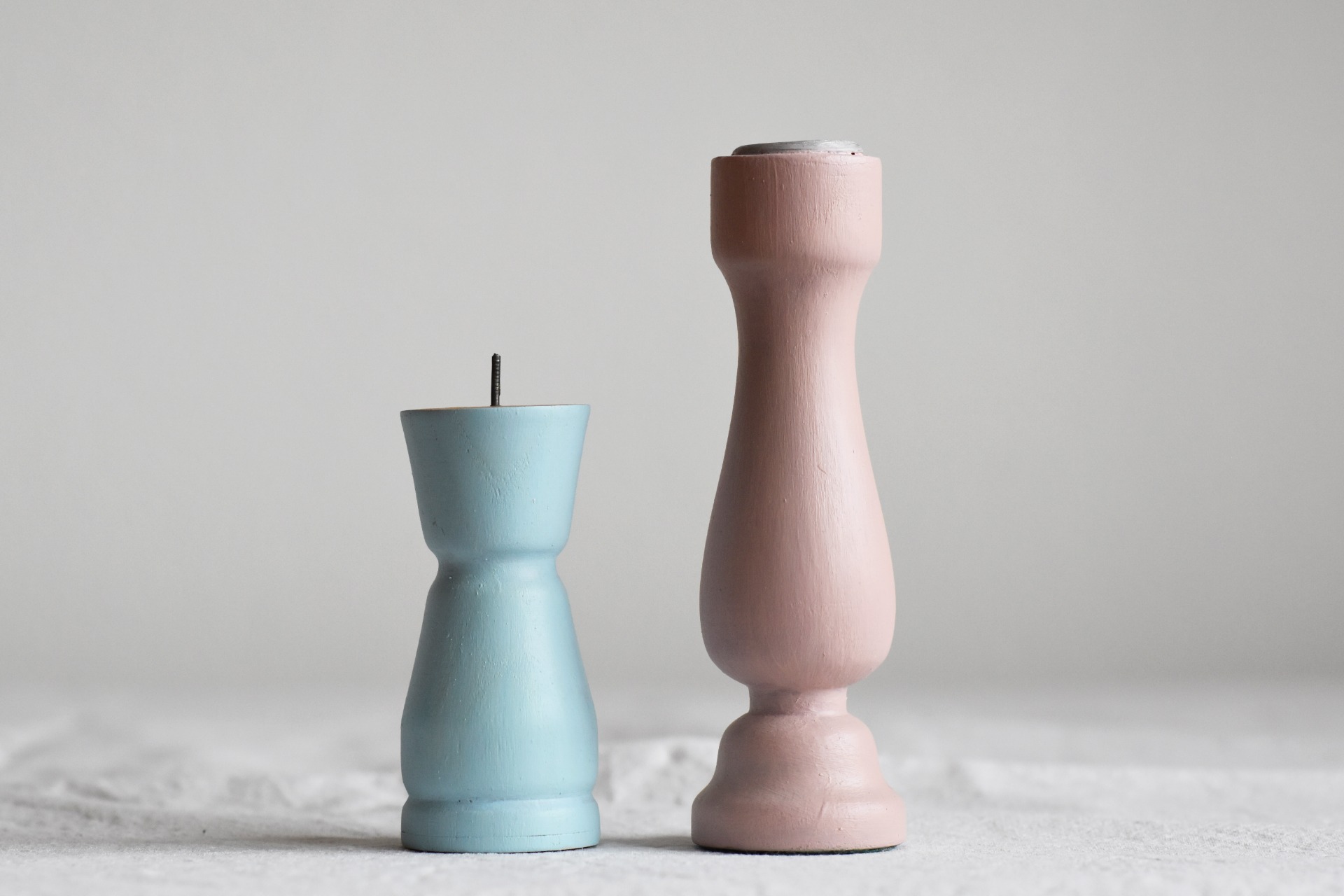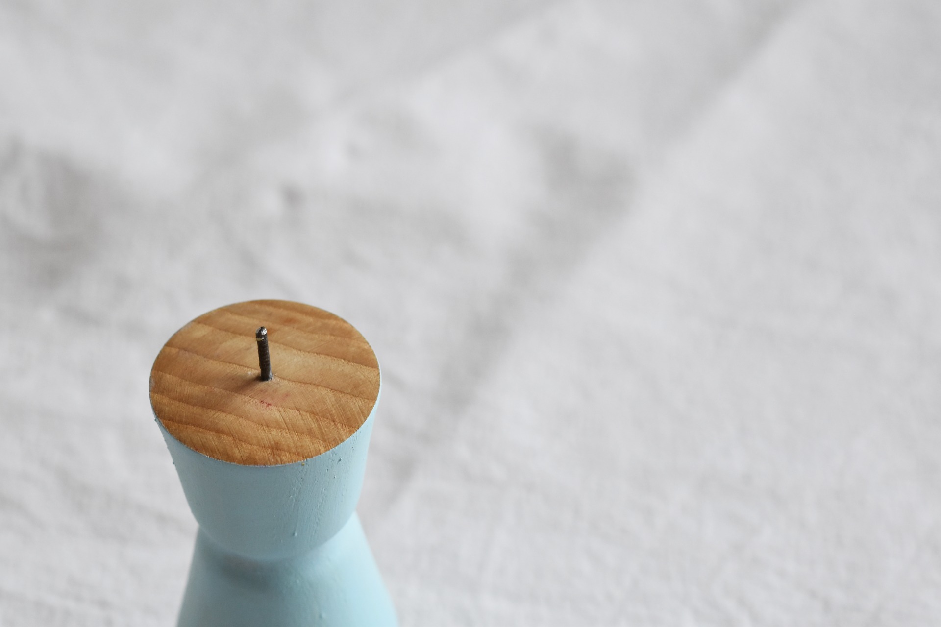 Dřevěný svícen. Natřeno akrylovými barvami, zafixováno matným lakem. na horní straně malá červená skvrnka viz foto. Při nasazení svíčky není vidět.