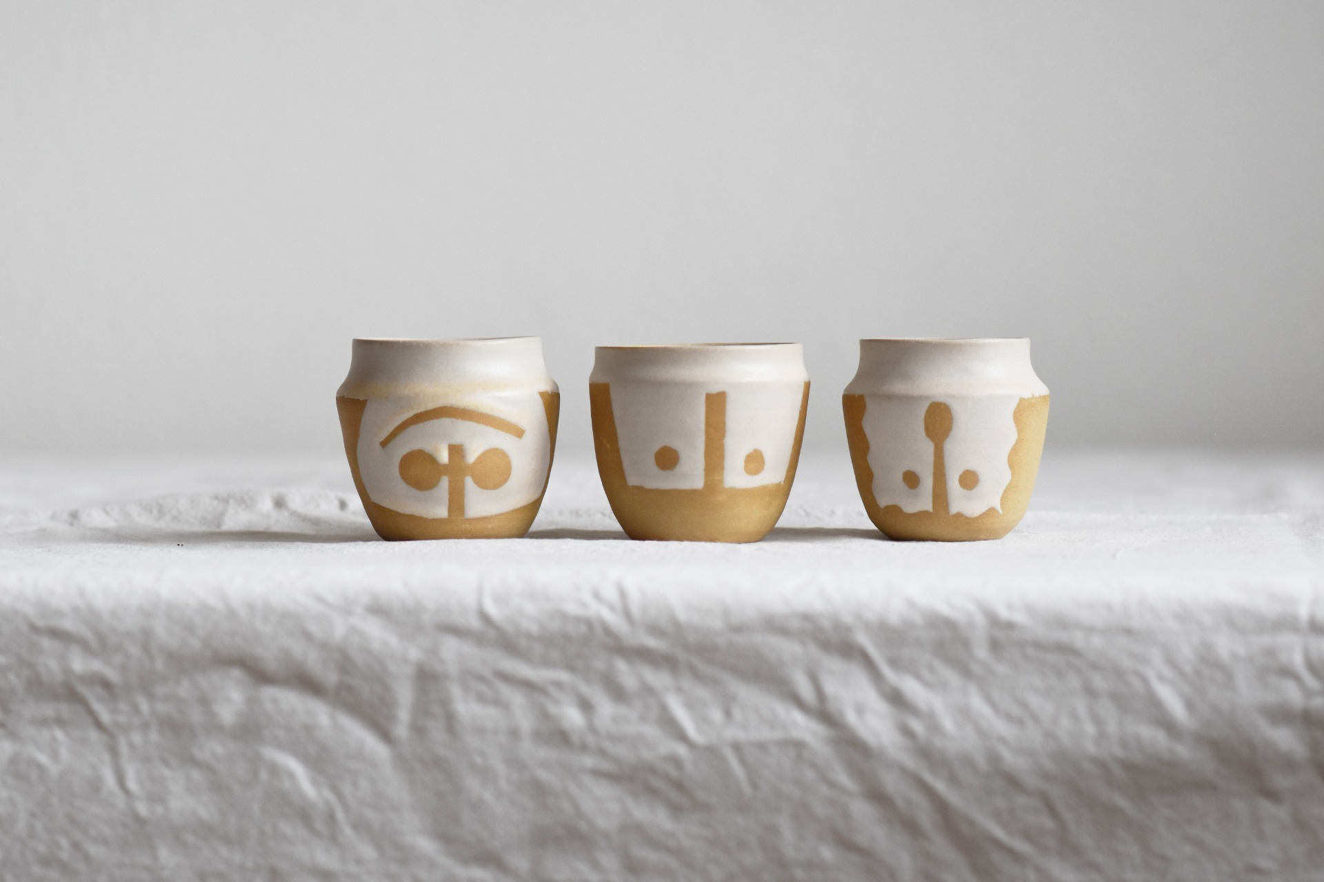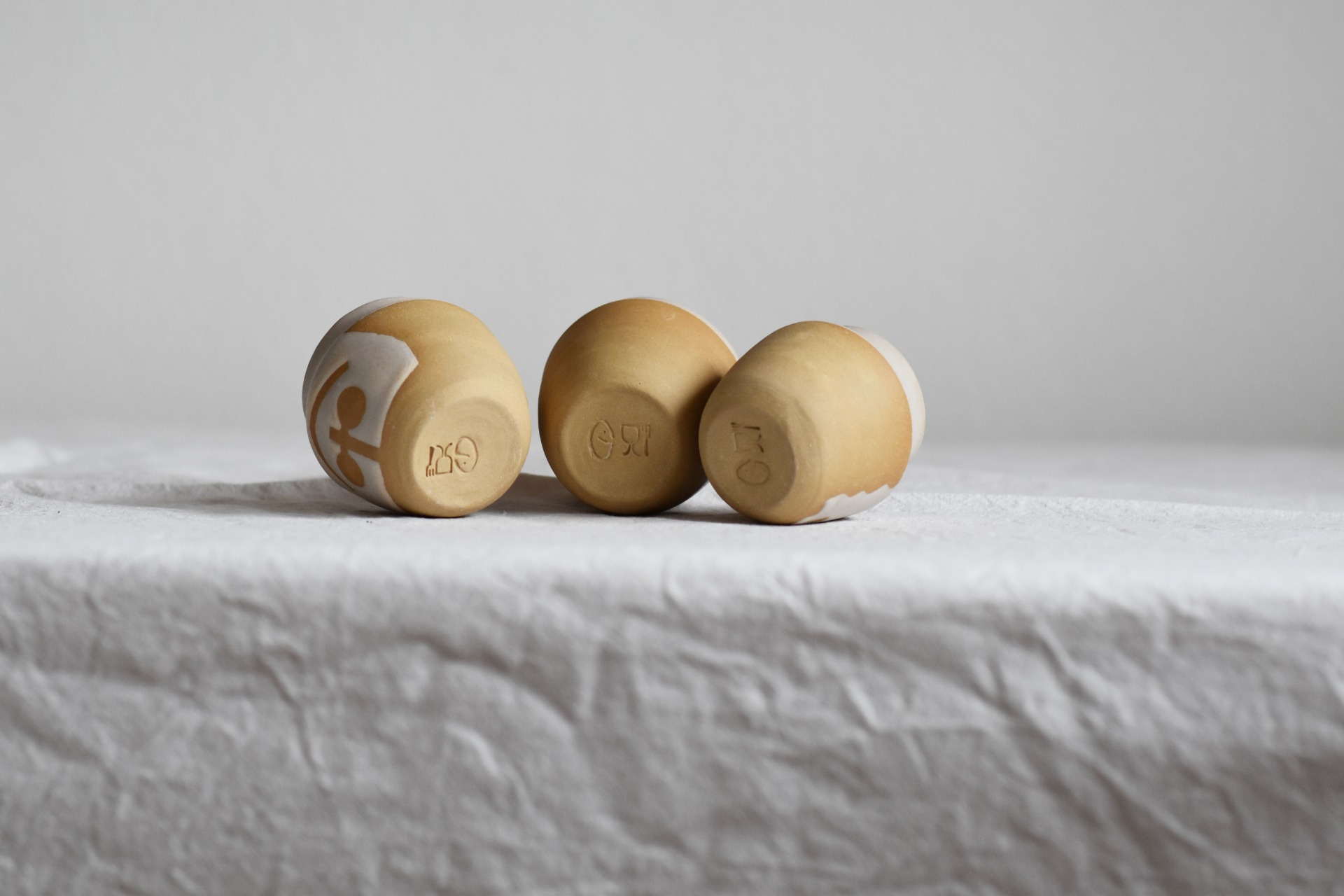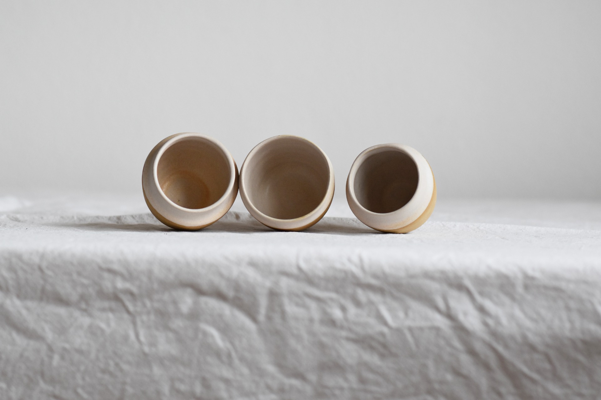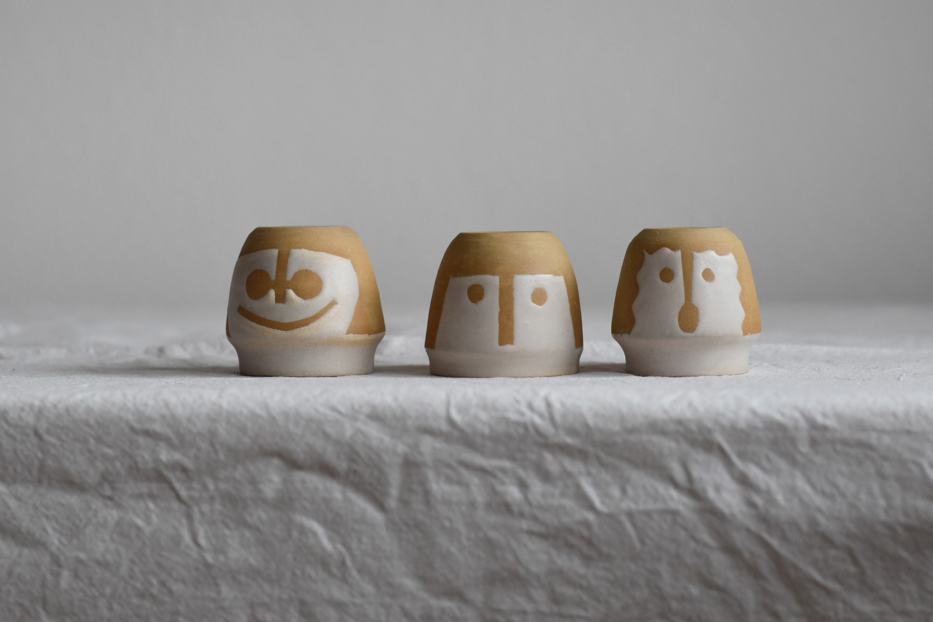 Sada tří kalíšků na nápoje o objemu 100 ml. Výška 7 cm. Vnitřek glazovaný, atest glazury pro nezávadnost při styku s potravinami samozřejmostí.